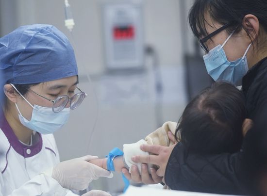 11月26日,杭州第一人民医院输液区,护士正准备给小朋友输液。视觉中国供图