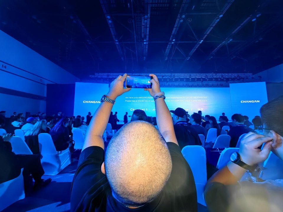 11月27日,长安汽车品牌东南亚发布会在泰国曼谷举行。一名与会者用手机记录这一时刻▼