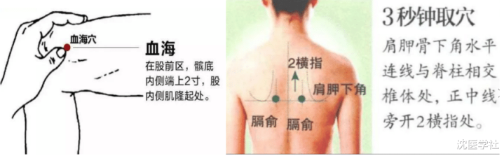 血海在大腿前段,膝盖内侧上2寸的位置;膈俞在后背,肩胛骨下角和脊椎连线上,脊椎旁2个指头的位置,这两个穴位治一切血症,专门化瘀活血的,我们想化瘀血的没事就可以多按按这两个穴位,会有不错的效果。