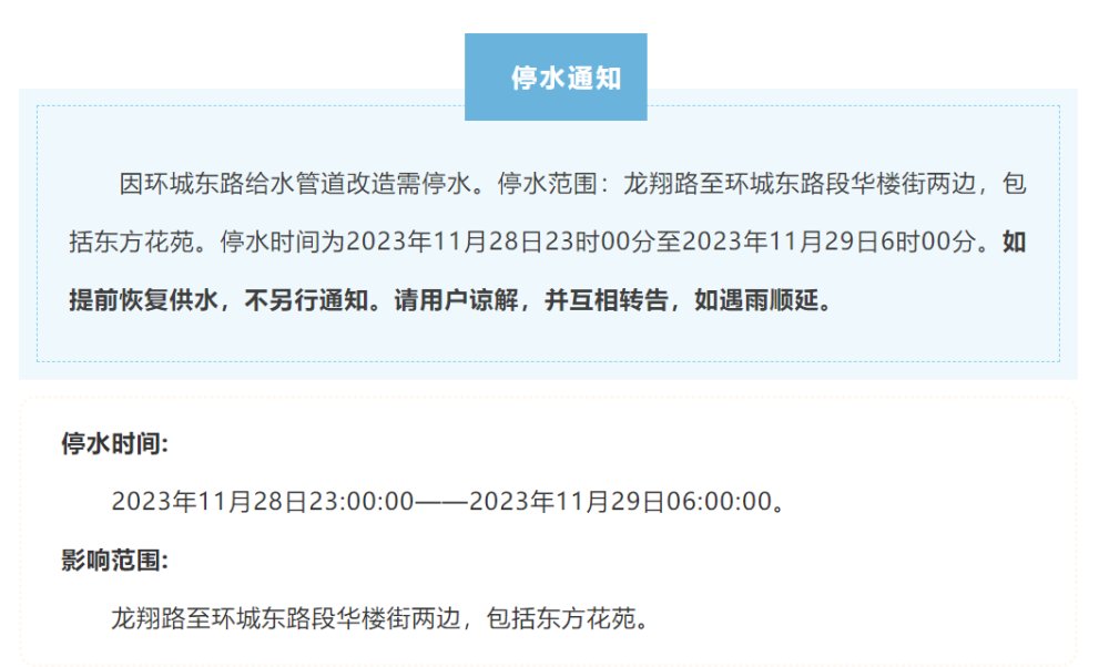 停水范围:龙翔路至环城东路段华楼街两边,包括东方花苑。