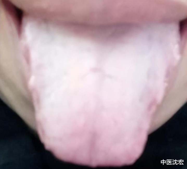 这个舌象拍的有点模糊,但是还是可以看出来他舌苔明显是发白,比较厚腻的,这种就属于典型的脾胃虚寒后,体内生成了痰湿,所以他除了刚才提到的症状呢,还会有明显的四肢困重,不想动,以及嘴里发黏发腻,或者是嗓子眼里有痰,上不去下不来的情况,所以我们想要用这个方子调理的话呢,就得在小建中汤的基础上,加点化痰的中药,像是陈皮、半夏之类的,另外他舌尖发白,有凹陷,属于是脾胃虚后,这气血生成少了,没法滋养心神了,平时会出现些头晕,失眠的情况,因此也得在此基础上,加点安心神,补气血的中药。