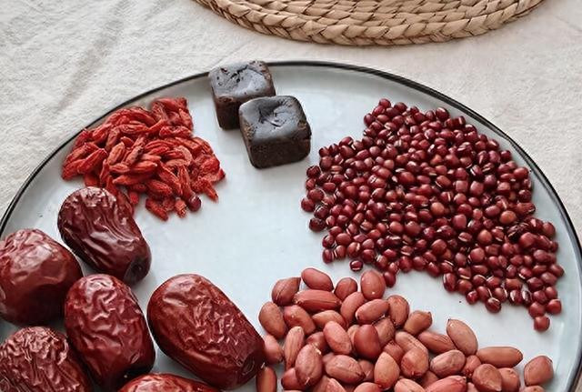 饮食上,可以喝五红汤,五红汤的“五红”,指的是大枣、红豆、红皮花生、红糖和枸杞五种红色食材。红豆,性平味甘,可理气活血,清热解毒;大枣,性味甘温,能补脾养胃,尤其善于补血;花生,健脾和胃,滋养气血。花生外面那层红衣是精华,一定不要去掉,补血止血都是靠它;枸杞子,性平味甘,滋补肝肾,阴阳双补;红糖性温味甘,暖胃缓肝,活血散寒。