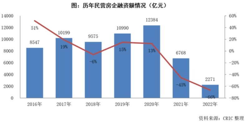 毕竟民营房企融资难的问题很突出,三道红线的监管要求提出后,房企降杠杆也按下了加速键,从2020年开始,民营房企的融资额情况就直线下降。据了解,2021年民营房企融资规模同比下降45%,开始爆发信用危机,2022年由于疫情等因素影响,民营房企融资更难,新增融资同比下跌66%,信用风险加剧。而且民营房企融资出现两极分化,少部分标杆民企能得到融资机会,大多数民企发展停滞,风险民企数量接近半数。