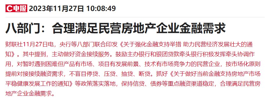 早前,金融监管部门就在拟定房企白名单,可能有50家国企和民企会上榜,且加大支持房企融资力度,强制银行执行,如今八部门再次强调要将融资措施落实到位,且明确表示要支持民营房企的金融需求,可谓是大利好!