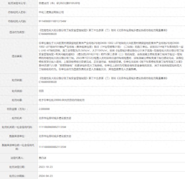 中国网财经10月24日讯(记者 舒越)北京市住房和城乡建设委员会近期发布消息显示,中化二建集团有限公司未按照规定组织危大工程验收被处罚。
