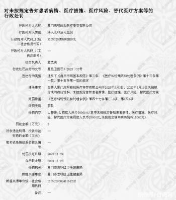 厦门思明唆和医疗美容被罚3万元 未按规定告知患者病情等