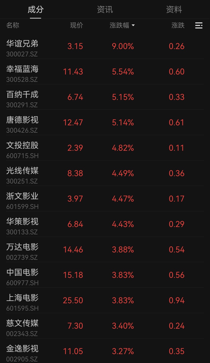 受此推动,截至7月31日收盘,影视股集体走强。华谊兄弟涨幅9%,幸福蓝海、唐德影视涨超5%,文投控股、光线传媒、华策影视涨超4%,万达电影、中国电影、上海电影、慈文传媒、金逸影视涨超3%。