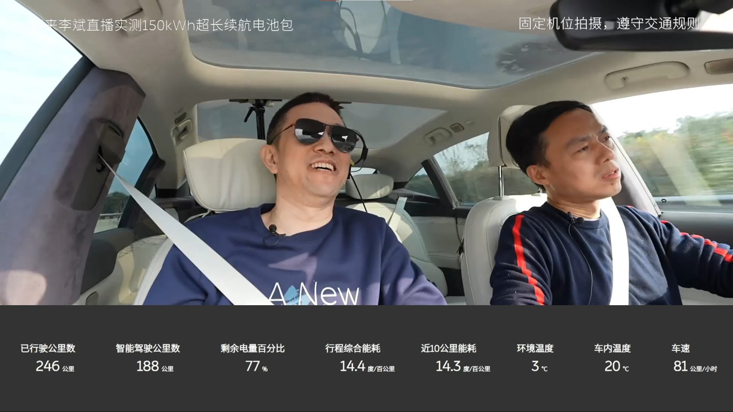 目前测试仍在进行中,截至IT之家发稿,李斌已经行驶 246 公里,剩余电量 77%,百公里综合电耗 14.4kWh,车内温度 20℃,环境温度 3℃,车速为 81km/h(本次测试通常在 90km/h左右)。