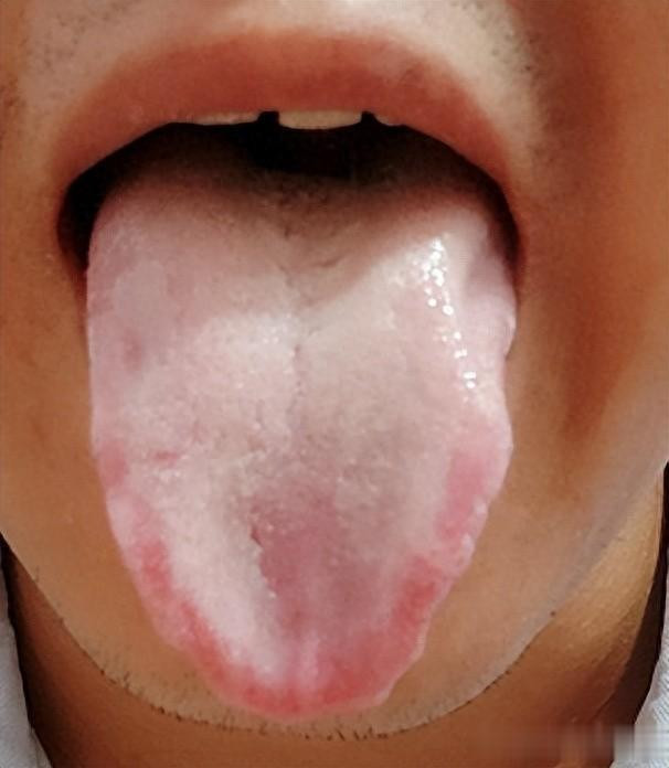 我们先看一下这个舌象,结合着舌象来讲这个问题,首先我们看这个舌尖,舌尖特别的红彤彤的,这个呢是心火过旺,这个呢上扰;另外呢,舌面水滑,舌苔我们看偏于白腻,在边上呢还是有齿痕的,这说明什么?