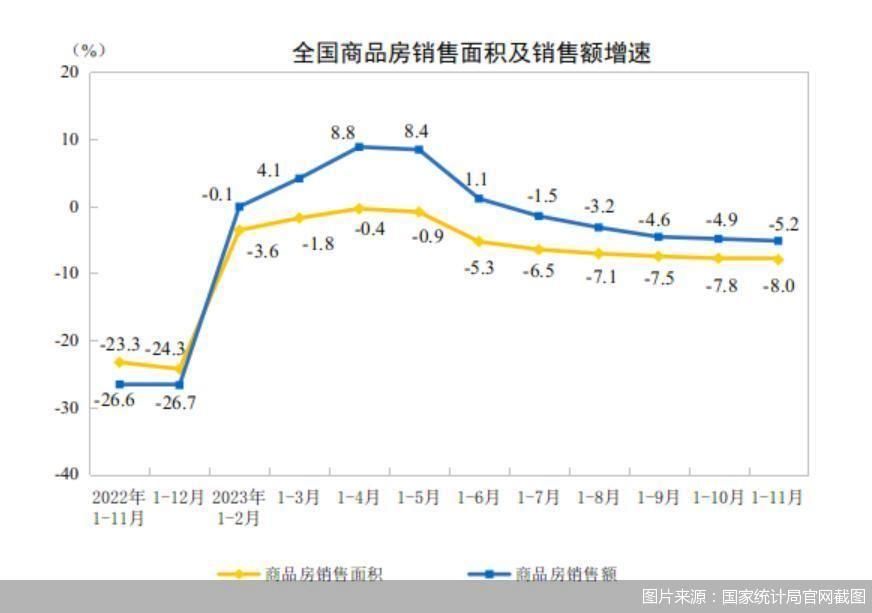 国家统计局数据显示,1—11月,商品房销售面积100509万平方米,同比下降8%,其中住宅销售面积下降7.3%。商品房销售额105318亿元,同比下降5.2%,其中住宅销售额下降4.3%。