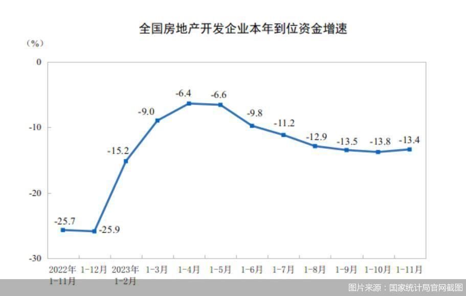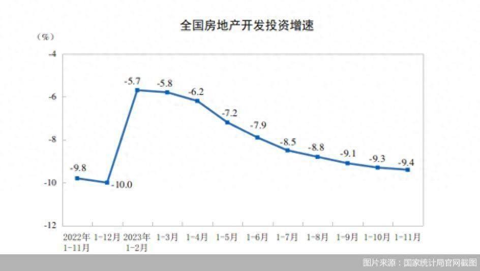 2023年1-11月,全国房地产开发投资额同比增速为-9.4%,该指标仍处于跌幅扩大区间,但下降幅度较此前几个月有明显收窄。