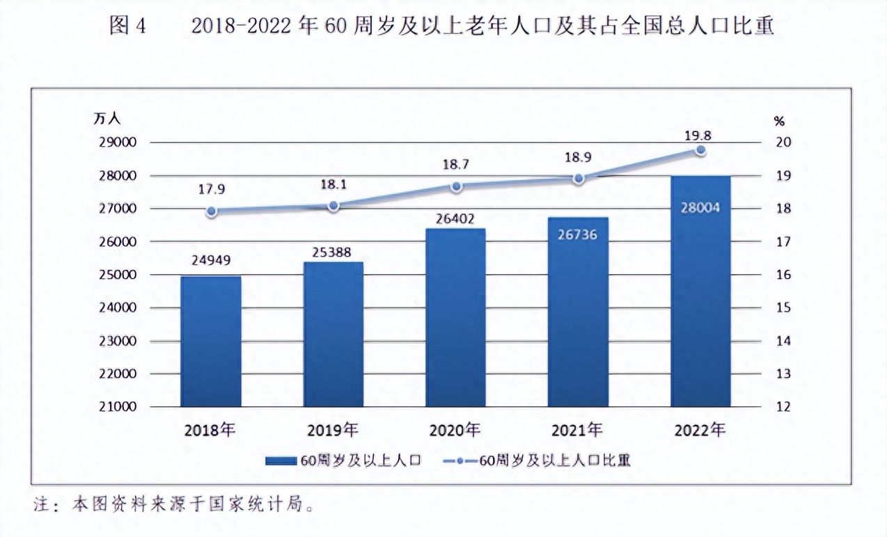 在公报公布的数据中,值得注意的是,截至2022 年底,全国60周岁及以上老年人口28004万人,占总人口的19.8%,其中65周岁及以上老年人口20978万人,占总人口的14.9%。