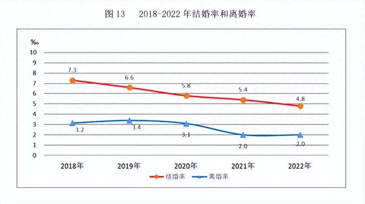 公报数据显示,2022年全年依法办理结婚登记683.5万对,比上年下降10.6%。结婚率为4.8‰,比上年下降0.6个千分点。