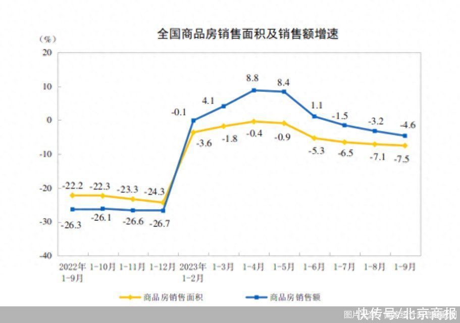 数据显示,1—9月份,商品房销售面积84806万平方米,同比下降7.5%,其中住宅销售面积下降6.3%。商品房销售额89070亿元,下降4.6%,其中住宅销售额下降3.2%。
