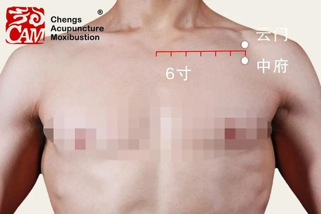 中府穴位于云门穴下1寸,即从云门向下量一个拇指的宽度为中府穴。定位云门穴时,沿着锁骨的下缘向外侧触摸,可摸到一个骨性隆起即为肩胛骨的喙突,喙突下的凹陷是云门穴。