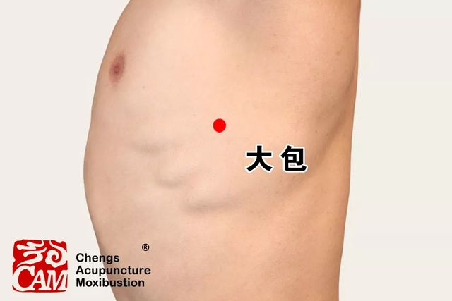 大包穴位于腋中线上,腋中线即在腋窝的顶点画一条垂线,该线与第6肋间相交的位置即为大包穴。或者双手握拳,拳柄相对,分别放在躯干两侧,与乳头平行,那么拳头顶住的位置,即大包穴所在位置。