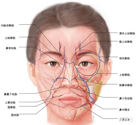在面部的鼻部、眉间、太阳穴、都有一部分血管联通颅内,位置打错就有可能出现脑梗甚至失去生命。