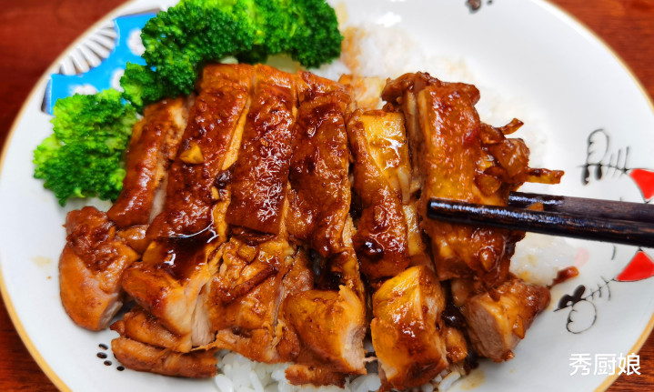 2. 在一个平底锅中,热一些橄榄油,将鸡腿两面煎至金黄色。倒入照烧酱汁,将鸡腿翻转并烧开。中小火炖约20分钟,直到鸡肉熟透且汁液变浓稠。