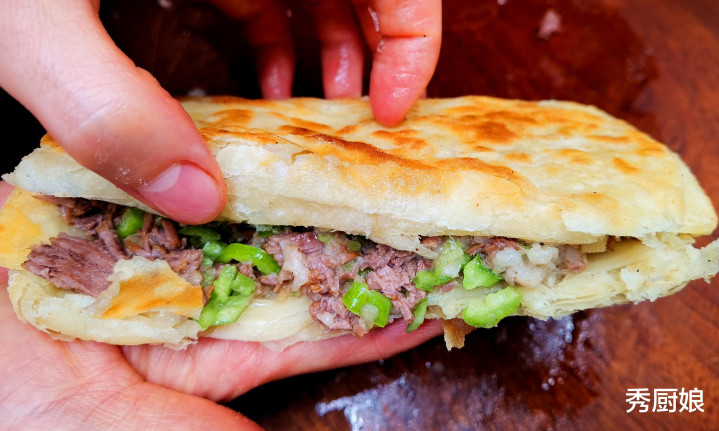 3. 将面团分成小剂子,擀成圆饼,用电饼铛烙熟,剖开一半,将五花肉和青椒、黄瓜剁碎,混合,夹在面饼里,就可以享用美味的肉夹馍了。