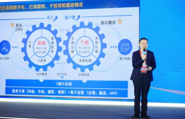 俞董表示,今年以来,美年健康数字化转型升级到数字化运营阶段,打造贯穿检前、检中、检后的全周期数字化健康管理体系。美年健康的数字化运营秉承“数据驱动、一看到底、高效协同、精准决策”十六字方针,以数字化思维打造数字化组织,全力深化企业数字化全面运营进程。美年健康的公司整体运营包括医疗运营、营销运营和服务运营,其中运营数字化的核心一环为“医疗、医质及服务运营”。营销数字化方面,美年健康依托星辰CRM客户管理系统和美年臻选C端线上商城两大数字化平台,打造团检、个检双轮驱动模式,一方面利用星辰CRM抓好团检过程管理,提升赢单率;另一方面利用美年臻选全面升级个检,通过多元大健康商品体系扩张,为客户创造更多衍生健康价值。