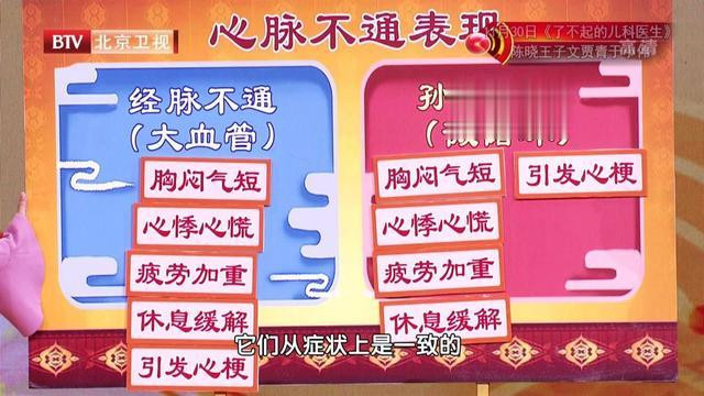 吴主任解释,经脉不通、孙络瘀阻都属于心脉不通,都会出现胸闷、气短、心悸、心慌等症状,也都有可能引起心梗。