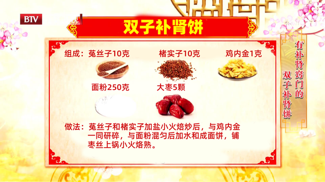 专家们还为我们带来了一道补肾药膳——双子补肾饼,有固精缩尿、强腰壮骨、补肾健脾的功效。