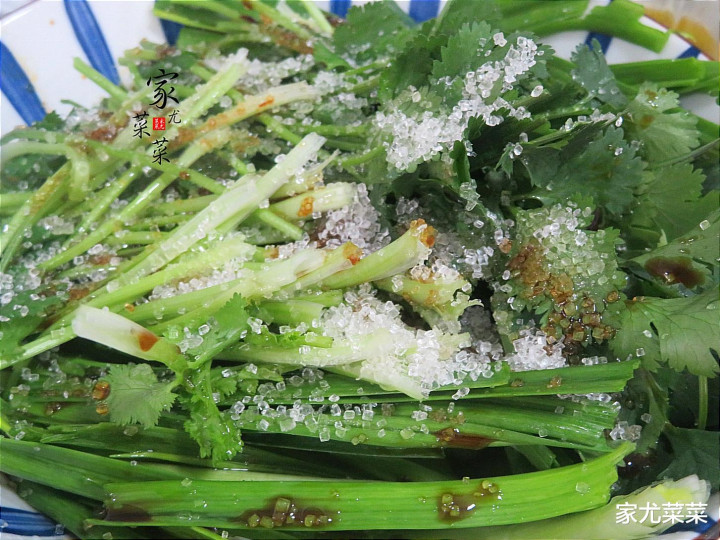 第1步:取嫩的青蒜苗1把、香菜1小把处理干净后,撒入食盐1小勺搅拌均匀,静置半个小时。