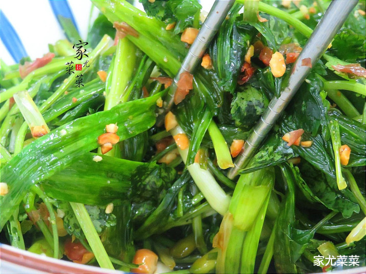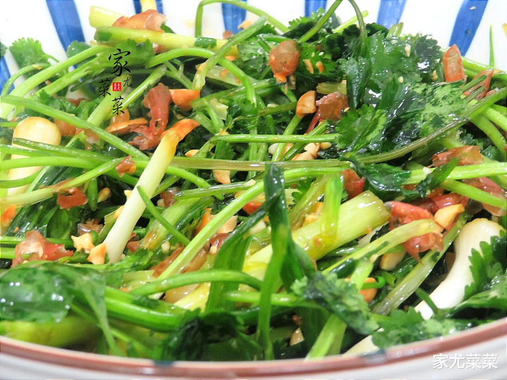 所用食材:青蒜苗1把、香菜1小把、花生米1小把、食盐1小勺、白糖2勺、花生油1勺、芝麻油小半勺、生抽小半勺