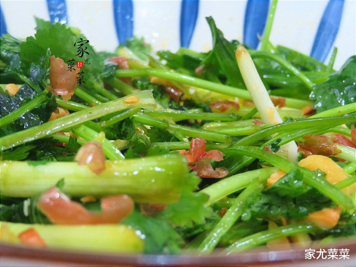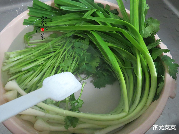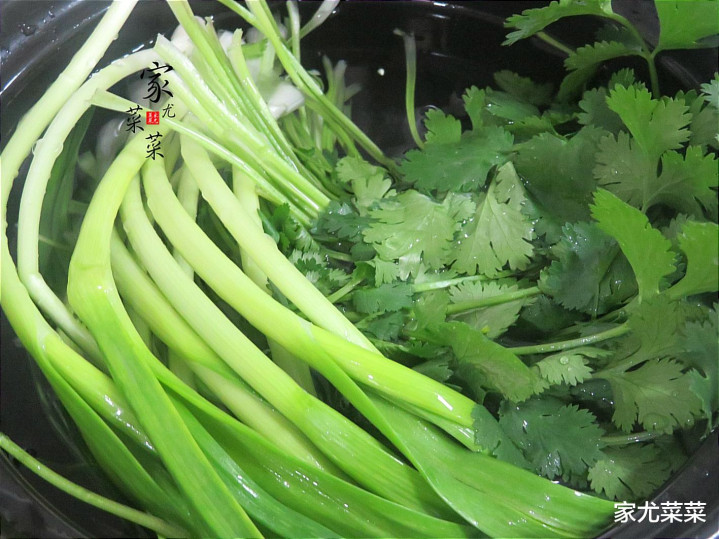 第2步:青蒜苗、香菜捞起后,再倒入凉开水里清洗一遍,再甩去多余的水分。