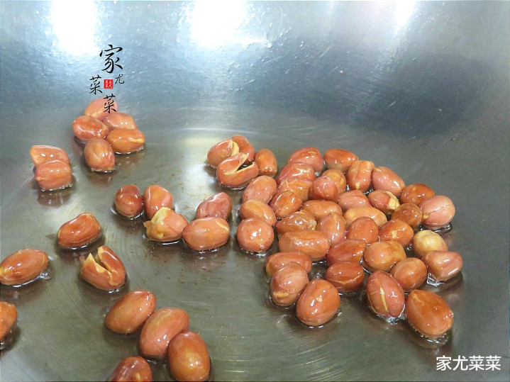 第4步:接着油热下花生米炸酥脆后,再压碎待用。