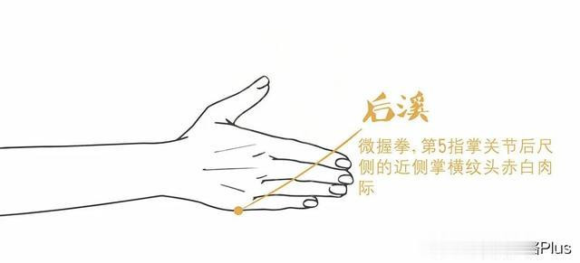 后溪穴位于人体的手掌尺侧,微握拳,当小指本节(第5指掌关节)后的远侧掌横纹头赤白肉际。