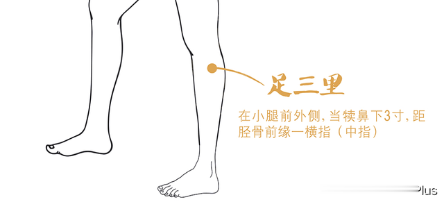 足三里穴位于小腿前外侧,犊鼻穴下3寸,距胫骨前嵴一横指(中指)处。