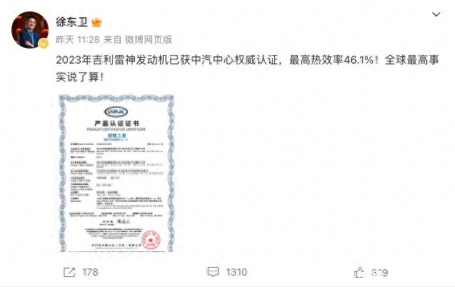 就在比亚迪宣称自己第五代DM发动机热效率全球第一之后,吉利高管在微博上集体开火,公布了吉利雷神发动机热效率达46.1%的专利证书。这下真是炸了锅了,比亚迪高管随后反击这种没量产更高热效率的专利“我们还有大把”,让吃瓜群众纷纷大呼过瘾。