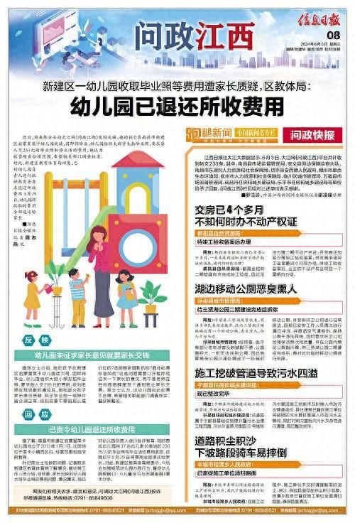 针对陈女士反映的问题,记者联系新建区教育体育局了解情况。据该局工作人员介绍,经核查,家长反映的幼儿园大班毕业照的费用问题,情况属实。现已对幼儿园负责人进行批评教育,同时责成幼儿园将37名幼儿家长缴纳的230元/人的毕业照和毕业活动费用退回,该园已于5月29日将费用全部退还给家长。对此,新建区教育体育局表示,今后会加强规范幼儿园办园行为,督促幼儿园根据《3~6儿童学习与发展指南》要求办学。