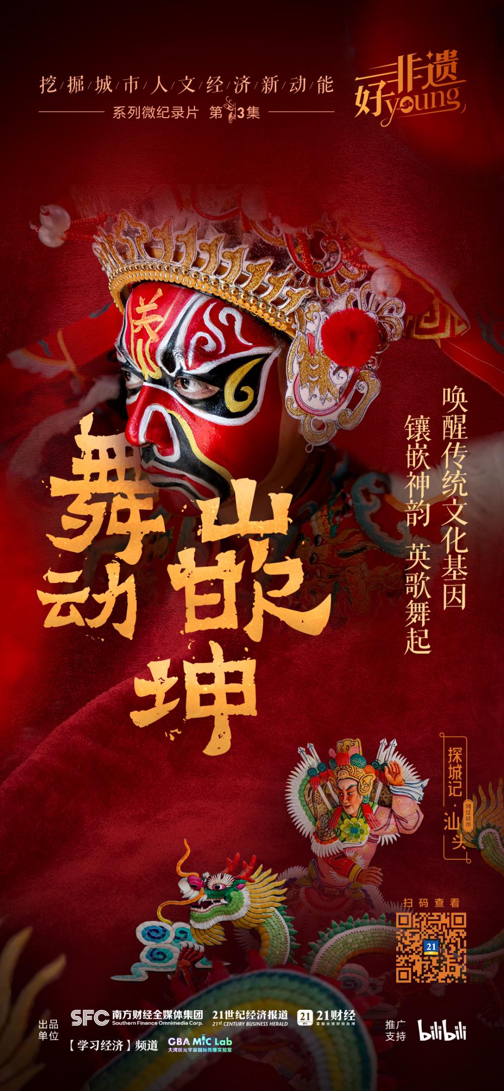 《非遗好young·挖掘城市人文经济新动能》第三集《“舞”动“嵌”坤:镶嵌神韵,英歌舞起,唤醒传统文化基因》走进潮汕文化重要的发源地、兴盛地汕头,置身其中感受今年以来霸屏各大网络平台的“战舞”英歌舞,它集戏剧、舞蹈、武术于一体,兼具祈福、娱乐等功能,英歌舞节奏强烈,气势恢宏。在英歌舞的舞动中,我们也将镜头上移,探寻那些静静地守护潮汕地区屋脊门楼的“永不褪色”的屋顶艺术——嵌瓷。