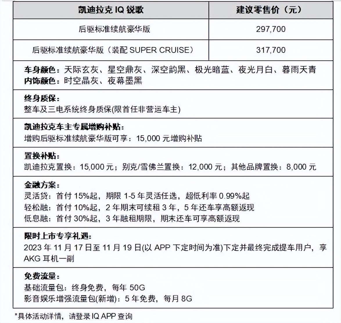 在11月17日开幕的广州车展上,上汽通用汽车凯迪拉克品牌宣布,IQ锐歌全新车型——后驱标准续航豪华版正式上市,售价29.77万元起。同时,凯迪拉克重磅推出限时尊享礼遇,即日起至2023年12月31日前下定IQ锐歌标准续航版的用户,可享整车及三电系统终身质保、至高价值15,000元的换购补贴等福利,并面向现有凯迪拉克车主推出专属价值15,000元的增购补贴。