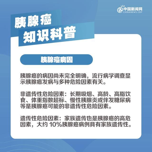 胰腺癌确切的诱因尚未可知,但吸烟是危险因素之一,吸烟者患胰腺癌的可能性是不吸烟者的2倍。与年龄也有关,通常在年龄45岁以上。糖尿病也是胰腺癌潜在危险因素。其他高风险因素还包括:慢性胰腺炎、肝硬化和胰腺囊肿;高脂饮食、肥胖和缺乏运动、癌症家族史也可能是发病的内在因素。