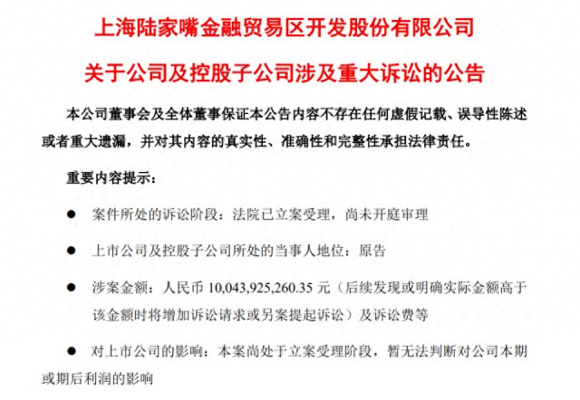 11月4日,上海陆家嘴集团发布公告:因土壤污染产生侵权纠纷,其下属子公司将苏钢集团、苏州市环境科学研究所、苏州市苏城环境科技有限责任公司、苏州国家高新技术产业开发区管理委员会、苏州市自然资源和规划局等告上法庭,并于近日收到了江苏省高级人民法院的书面案件受理通知书。