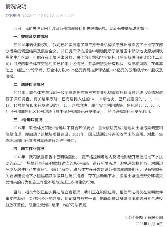情况说明称,2016年转让股权时,公司已如实披露了第三方专业机构关于苏州绿岸名下土地存在部分污染的调查结果及报告全文,并在资产评估报告中明确提示了该范围中部分地块原为钢铁焦化生产区域,可能存在土壤污染风险。竞拍方在交易时即已知悉上述情况,并承诺接受所有现状、瑕疵和风险。在此基础上,经过222轮举牌,以85.25亿元竞得挂牌评估值30.5亿元的苏州绿岸95%股权及债权。